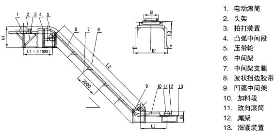 M3/h35° 28 36 50 71 104 120 157 195 216 327 331 466 500 794 45° 19 25 33 57 83 97 127 157 175 271 267 384 414 680 60° 15 19 23 40 58 59 90 112 124 197 190 278 302 524 90 9 11 15 21 31 37 48 60 66 106 102 149 162 281 外型尺寸 頭輪帶面高H1 1200 1350 1615 1815 2000,2200 2300,2525 2525,2700 尾輪帶面高H2 690 800 950 1115 1250,1400 1600,1700 1600,1700 中間段帶面高H3 700 800 850 1115 850,1200 1400,1500 1600,1700 中間段地腳高B1 580 850 1020 1220 1440 1690 1890 注:本表中輸送量按最小橫隔板間距計算,帶速增減,輸送量成倍增減,其他物料可參見此表確定。